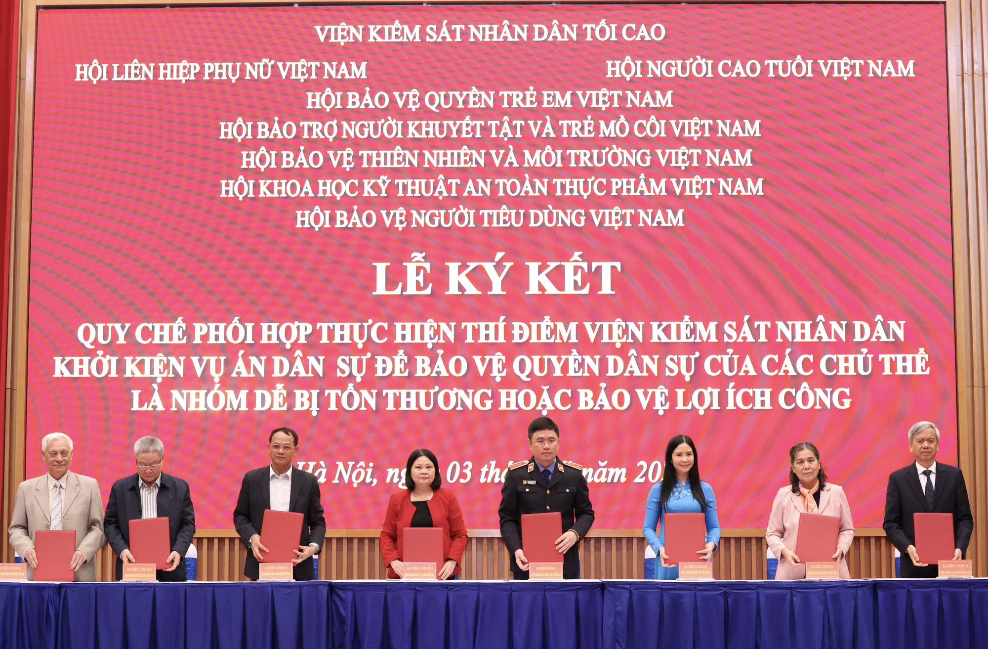 Chủ trì lễ ký kết có: Viện trưởng Viện KSND tối cao Nguyễn Huy Tiến. Tham dự ký kết có: Ủy viên TƯ Đảng, Phó Chủ tịch Ủy ban Trung ương MTTQ Việt Nam, Chủ tịch Hội LHPN Việt Nam Nguyễn Thị Tuyến; Chủ tịch Hội Bảo trợ người khuyết tật và trẻ em mồ côi Việt Nam Nguyễn Trọng Đàm.